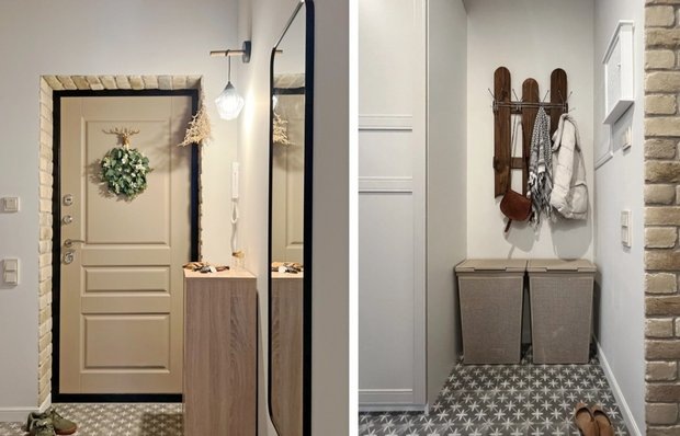 Кирпичная кладка, деревянный потолок и много хранения Сегодня расскажем о красивых и функциональных идеях, которые мы подсмотрели в евротрешке дизайнера Оксаны Барнаш. Из голых стен в бетоне она обустроила просторное и комфортное пространство в средиземноморском стиле. Смотрим, какие решения использовала Оксана при создании собственного интерьера прихожей-коридора. Потолок в прихожей отделан вагонкой, декорирован брусом и покрыт маслом. Это было сделано для того, чтобы провести коммуникации, которые идут от электрощитка под потолком. Также такое решение помогло визуально снизить высоту потолка в узком пространстве, убирая эффект колодца. Грязную входную зону выделили такой же красивой плиткой, как в кухне и в санузле. Оксана не любит закрывать двери в комнаты, поэтому одинаковая отделка объединяет пространства, делает дизайн цельным и завершенным. Откосы входной двери Оксана оформила остатками декоративного кирпича, который использовала для отделки других комнат. Они делают красивый ак