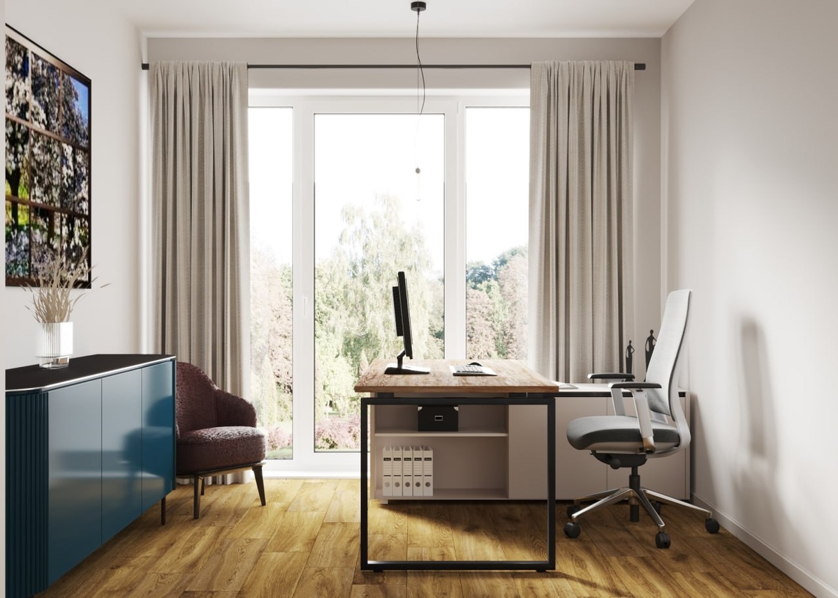 🌟Для работы предусмотрен большой стол с минималистичным светильником. Клиентка практикует йогу, поэтому здесь установили спортивное зеркало. Она также любит рисовать, и мольберт спрятан в большом шкафу. Яркая картина, подаренная мужем, дополняется комодом в любимом цвете клиентки. В минуты отдыха можно посидеть в кресле, помечтать и насладиться видом на горы Швейцарии.