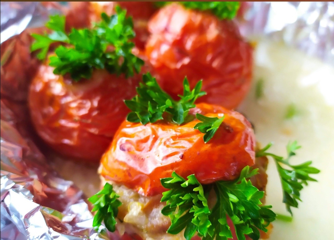Это очень вкусное летнее блюдо, которое напоминает фаршированные перцы. Только вместо болгарских перцев мы используем помидоры, большие и мясистые. Итак, рецепт. Ингредиенты: Большие спелые томаты 6 шт. Лук репчатый 1 шт. Морковь 1 шт. Фарш свино-говяжий 400 гр. Рис 0.5 стакана 1 яйцо Соль и специи по вкусу (я добавляю хмели-сунели) Зелень укропа, петрушки по вкусу. Также можно добавить базилик или любисток, они очень хорошо сочетаются с томатами. Масло оливковое по вкусу. Приготовление. Помыть помидоры, просушить. Срезать верхнюю крышечку и выскоблить мякоть с помощью ложки или ножа для удаления сердцевины яблок. Крышечку не выбрасываем, она нам впоследствии потребуется. Мякоть от томатов можно использовать для приготовления гаспачо либо томатного супа (рецепт я обязательно выложу чуть позже). Томаты внутри можно немного присыпать солью. Теперь займёмся начинкой. Рис можно замочить накануне на ночь или хотя бы оставить на 1 час в воде. Затем рис посолить, поставить на ого