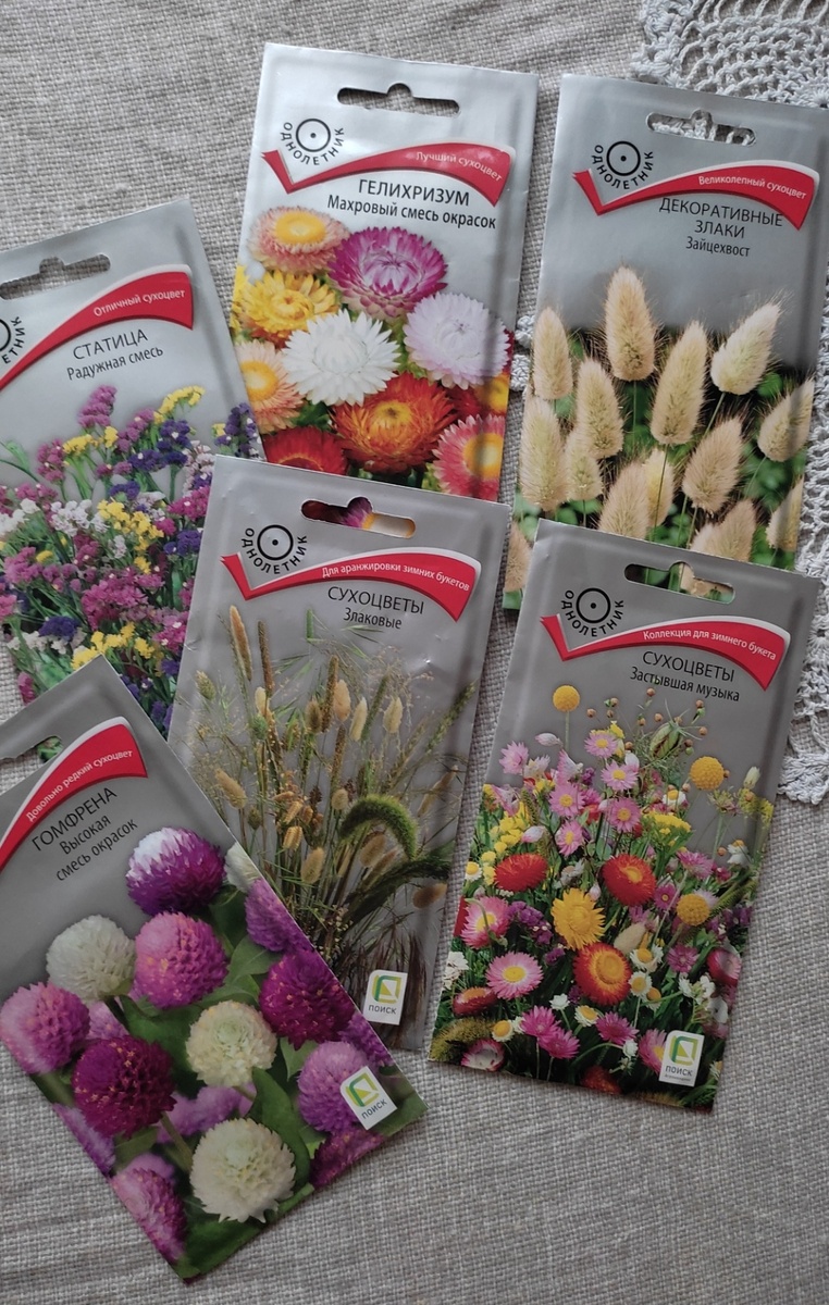 Добрый день всем! Лето перепрыгнуло свою половину и стремительно идёт на убыль. Очень хочется оставить в воспоминаниях его частички. Давно приглядывалась к сухоцветам, к этому сезону подготовилась. С осени были куплены семена. Семена гомфрены, гелихризума, статицы я сажала в марте и высаживала в грунт после возвратных заморозков. А семена злаков сеяла в апреле сразу в грунт. И вот можно срезать первый букет. Статица была представлена смесью цветов, пока белый цвет в приоритете, но по бутонам видно, что все кусты разнообразные. Очень интересна голубая с белым. Гелихризум пока двух расцветок. Их я срезала и подсушила вниз головками. Гомфрена ещё на розовых бутонах. Срезала злаки. Много колосков было на зайцехвосте. Злаки я подвесила сушиться в прохладном предбаннике. Срезала вот такие хохолки. Похоже на просо. И такие мохнатки. Гугл-камера определила, что это щитинник, или лисий хвост. Когда всё высохнет и примет нужную форму сформирую букетики, а пока вот так. Спасибо за вни