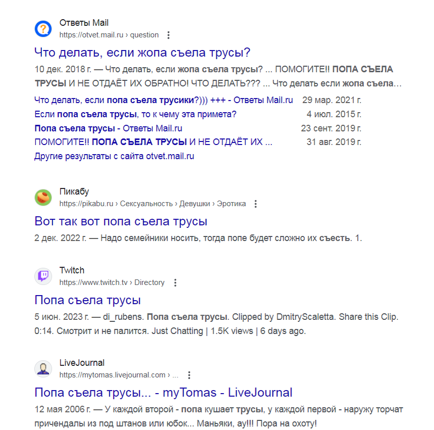 Об этом потрясающем выражении, плача от смеха, я прочитала на канале, посвященном английскому языку (ссылку дам внизу, кому интересно). По некоторым признакам фразу «трусы попа съела» можно считать поговоркой. Во-первых она очень широко распространена. Во-вторых достаточно устойчива, хотя есть варианты. Не все любят сюсюкать и попу часто называют менее деликатным словом. Слово съела иногда заменяют словом зажевала, которое в нужном значении уже входит в словари: «зажевать – защемить что-то между движущимися частями какого-то механизма» (хотя ягодицы трудно назвать механизмом). Обозначает это выражение... Ну вы и сами знаете, что оно обозначает... То, что это действительно известное выражение, которое широко употребляется, я люблю подтверждать мемами, но тут обойдусь, а то «Дзен» запретит показы, очень уж иллюстрации интересные. Приложу просто скрин ответов по запросу: Нет, повезло, нашла один мем) А, чуть не забыла! Ссылка на сайт-первоисточник: Как сказать "трусы попа съела" на англи