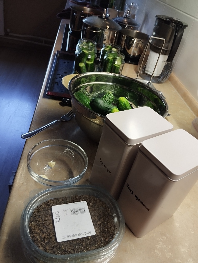 Это универсальный маринад, постепенно пришли к нему за несколько лет. Делать так можно любые овощи и будет вкусно. Обычно я делаю большие банки пополам помидоры с огурцами, но в этот раз я делала маленькие баночки маринованных огурцов. Можно использовать и капусту, и лук, и болгарский перец, и даже добавить яблоко. Маринад и сладкий и соленый и уксуса достаточно, не много и не мало. Если в банке есть огурцы, приходится делать с двумя заливками, и только в третий раз заливать маринад. Огурцы плотные и плохо прогреваются. А в этот раз у меня были маленькие баночки по 450гр, чтобы съесть за день-два. Решила, что со стерилизацией мне будет проще. В мою кастрюлю влезает по 4 баночки. Кипятила банки по 10 минут после закипания воды. Получилось 12 банок, не так уж много времени заняло. Пока кипела одна партия, подготавливала следующую. Ставила прямо в горячую воду. Банки предварительно стерилизовала в духовке, 20 минут на 120С. Крышки в это время кипели в кастрюле. Огурцы я купила маленькие и