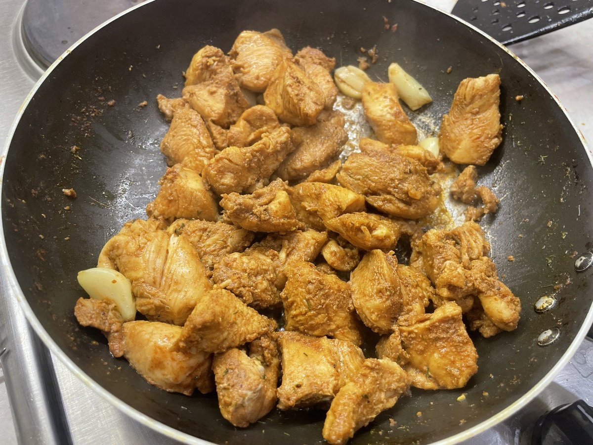 Сначала соберите все необходимые ингредиенты. Для курицы подойдут как грудка, так и бедра. В список специй можно добавить любимые варианты — паприку, хмели-сунели и другие.