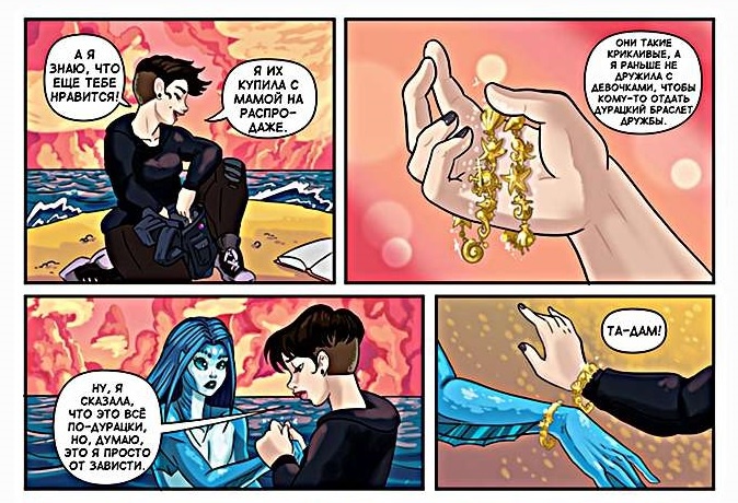 Сегодня вас ждёт продолжение комикса про девочку, увлечённую гот-культурой и волшебного морского создания. "Море в тебе" нарисован с 2017 по 2020 г, больше 300 страниц и законченная история с оригинальным сюжетом и рисовкой. Это душевный и добрый комикс про необычную дружбу подростка Коринф и русалку Сциллу, которая не хотела убивать людей. В оригинале история называется "The Sea in You". Автор оригинала: Jessi Sheron. Официальный сайт: tapas.io. Переводчик: StaceyNicks. Целиком на русском языке можно прочить на Акокомиксе. Возрастное ограничение 13+. Ссылка на прошлый выпуск: Коротко о событиях прошлых выпусков. Однажды, обычная школьница познакомилась с русалкой. Сначала существо из иного мира было настроено враждебно, но получив угощение, рыбодева подобрела и стала более разговорчивей. Подростки подружились. Сцилла даже спасла Коринф от злой людоедки, своей сестры. Девчата обменялись морскими сокровищами. Сцилла начала знакомиться с обычаями и предметами из мира людей. Чуть ранее Ко