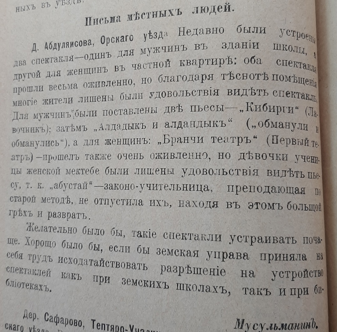 Добрый день гости и подписчики моего канала! В 2023 году наткнулся на одну интересную статью. Заметка вышла в издании "Оренбургское земское дело" в апреле 1916 г. Автор статьи подписался как "Мусульманин". Жалко, что написано в общем порядке, без фамилий и имен. Недавно были устроены два спектакля: один для мужчин в здании школы, а другой в частной квартире, оба спектакля прошли весьма оживленно, но "благодаря" тесноте помещения многие жители были лишены удовольствия видеть спектакль Для мужчин были поставлены две пьесы "Кибирги" ("Лавочник"); затем "Алдадык и алдандык" ("Обманули и обманулись"), а для женщин "Бранчи театр" ("Первый театр") - прошел также оживленно, но девочки ученицы женской мектебе были лишены удовольствия видеть пьесу, т.к. "абыйстай" - законо-учительница, преподающая по старой методике, не отпустила их, находя в этом большой грех и разврат. Желательно было бы, такие спектакли устраивать почаще, Хорошо было бы, если земская управа приняла на себя труд исходатайст