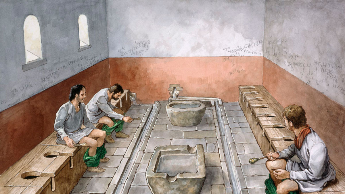 Древнеримские общественные туалеты представляли собой ряды сидений с отверстиями, ведущими в вырытую под ними яму — и никаких перегородок и, тем более, отдельных кабинок не подразумевалось. Римляне вовсе не рассматривали посещение туалета как интимный процесс — наоборот, они активно пользовались этим временем для поддержания социальных отношений: беседовали с друзьями, заводили новые знакомства, делились сплетнями и слухами, а порой даже обсуждали государственные дела. Читайте также: Что общего между голубятнями и колумбариями