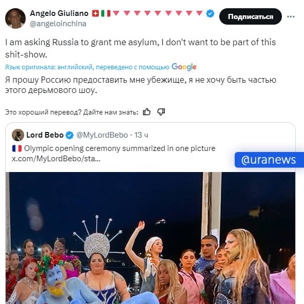 Вставим и мы свои пару копеек в открытие «олимпиады». Пишем её название в кавычках не просто так, ибо МОК нарушил все свои принципы запретив выступать там нашим спортсменам. Это уже не Олимпиада, каковой она считалась ещё совсем недавно, которая несла своей целью благие намерения. Сейчас она превратилась в руках кукловодов в инструмент. Даже не знаем, чего конкретно инструмент Мы сразу скажем, что открытие «олимпиады» не смотрели, но нарезку этого шабаша и чёрной мессы видели. Зрелище для нормального человека запредельное. Вот, например, реакция итальянского журналиста: Или вот Маск: Он обозвал "вибрациями конца света" и "крайним неуважением к христианству" шоу (оцените сами кого на фото выше) на открытии «олимпиады». Были в Европе и ряд изданий, которым не понравилось открытие. Кто-то посчитал его слишком скучным, кто-то хотел бы видеть в центре действия спортсменов, а не синих полуголых мужиков. А многие вообще сказали также открыто: «Это крах христианской цивилизации». Подвела черту