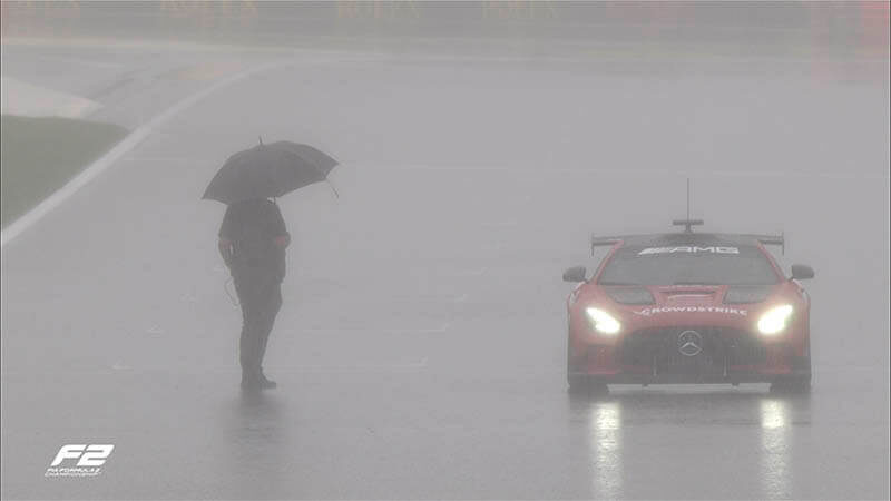 Спринтерская гонка Формулы-2 в рамках Гран-при Бельгии Формулы-1 была отложена из-за сильного дождя на трассе Спа-Франкоршам. Как и в случае с спринтерской гонкой Формулы-3 в Сильверстоуне, которая также была отложена из-за дождя, есть вероятность, что 18 кругов можно будет провести после квалификации Формулы-1, если позволят условия. В гонке с частично реверсивной стартовой решеткой гонщик «ART» Зак О’Салливан должен стартовать с поул-позиции, а Деннис Хаугер из «MP Motorsport» присоединился к нему в первом ряду. Показав лучшее время в квалификации, претендент на чемпионство Пол Арон «Hitech» должен был занять 10-е место, но из-за пары штрафов в пять позиций за проступки в прошлый раз в Венгрии ему пришлось откатиться на 20-е место. Его коллега Габриэль Бортолето «Invicta» и лидер чемпионата Исак Хаджар «Campos» стартуют с девятого и восьмого мест соответственно. Объявление об отсрочке гонки прозвучало после 50-минутной задержки начала процедуры старта: 22 машины оставались на пит-лей