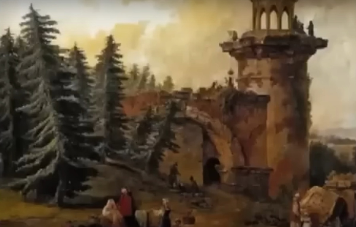Следующая картина — "Романтический сад". Такие сады, в упрощенном виде, были знакомы многим после распада СССР, когда начали забрасывать участки. Осенью люди из окрестностей бродят среди заросших кустов и постепенно исчезающих развалин, собирая то, что дала природа. Кривая полусгнившая ветка в центре картины свидетельствует о том, что за садом не ухаживают. Далее идет картина "Развалины в Риме", где люди завели домашних животных, было мясо и молоко, а сверху всё заросло мелкими деревьями. Чем же занимались люди в послекатастрофный период? На вашем экране картина "Снос замка Мэдден". Они организовали расчистку завалов, значит, уже существовало самоуправление.