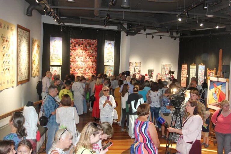 Проект «Лоскутные фрейлины» обещал что-то невероятно интересное и загадочное: необычные работы, коллекция с авторскими принтами, вкусные пирожки и костюмированный перфоманс. Поэтому на вернисаж, назначенный на 18:00, калужане стали собираться заранее. Но в зал никого не пускали. Поклонников современного лоскутного шитья в Калуге много. На вернисаж собрался полный зал. За закрытыми дверями было темно, и в этой полной темноте раздавалось народное пение. - Готовят сюрприз, - сказала заведующая выставочной деятельностью калужского Инновационного культурного центра Анна СЕНАТОВА. Пришлось ждать строго назначенного часа. Между тем, народу собиралось все больше. Гости поднимались на второй этаж и, выстроившись на лестнице, терпеливо ждали. И вот двери открылись. В полной темноте все тихонько начали заходить в зал. Там за столом при свете лампы, накрытой абажуром, сидели девушки в бусах и кокошниках и парни в косоворотках, которые запели: Собиралась красная девка всё за барина замуж А попала к