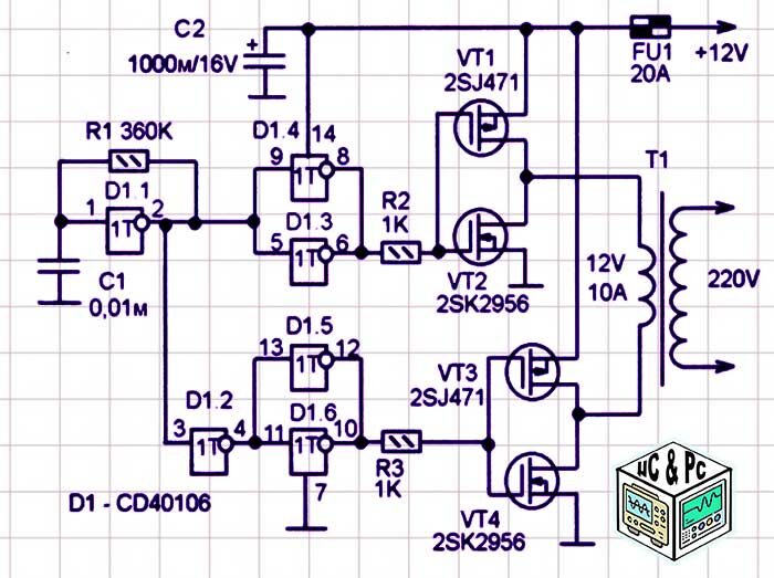 Принципиальная схема простого инвертора напряжения 12В — 220В (CD40106, 2SJ471, 2SK2956)
