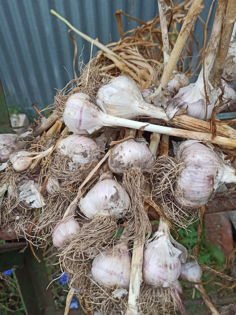 Пред история тут. Лук лег чеснок начал желтеть и требовать выкопки. На заметку, тот лук что не был спален помогайкой лег и был готов к сбору на две- три недели позже. Для выкопки и выдерживания были привлечены обе помогайки одна с лопатой на чеснок вторая лапками лук дёргала. Чеснок, на фото видно разницу в размерах голов, тот что справа крупный весной не горел. Остальное получило ожоги разной степени тяжести. Лук погорелец вырос при кого таким, и это в основном самые крупные экземпляры увы. Лук до которого не добрался пожар любопытства вот такой. А это у меня Шалот такой вымахал и почти весь одиночный на семейки не разделился, возможно сеянец мой был маленький.