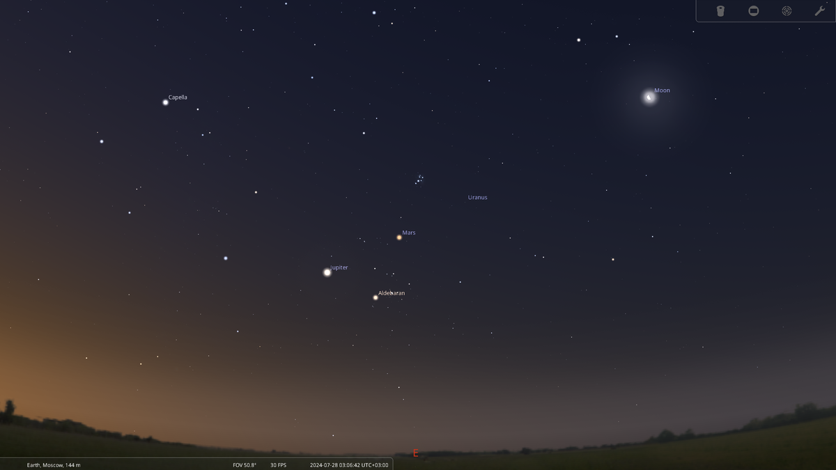 Уже пару недель прекрасно видны в созвездии Тельца две яркие планеты - Юпитер и Марс - обе поблизости от роскошных звездных скопления Плеяды и Гиады. Но утром 30 и 31 июля к ним подберется стареющий серп Луны, и это будет особенно красиво.