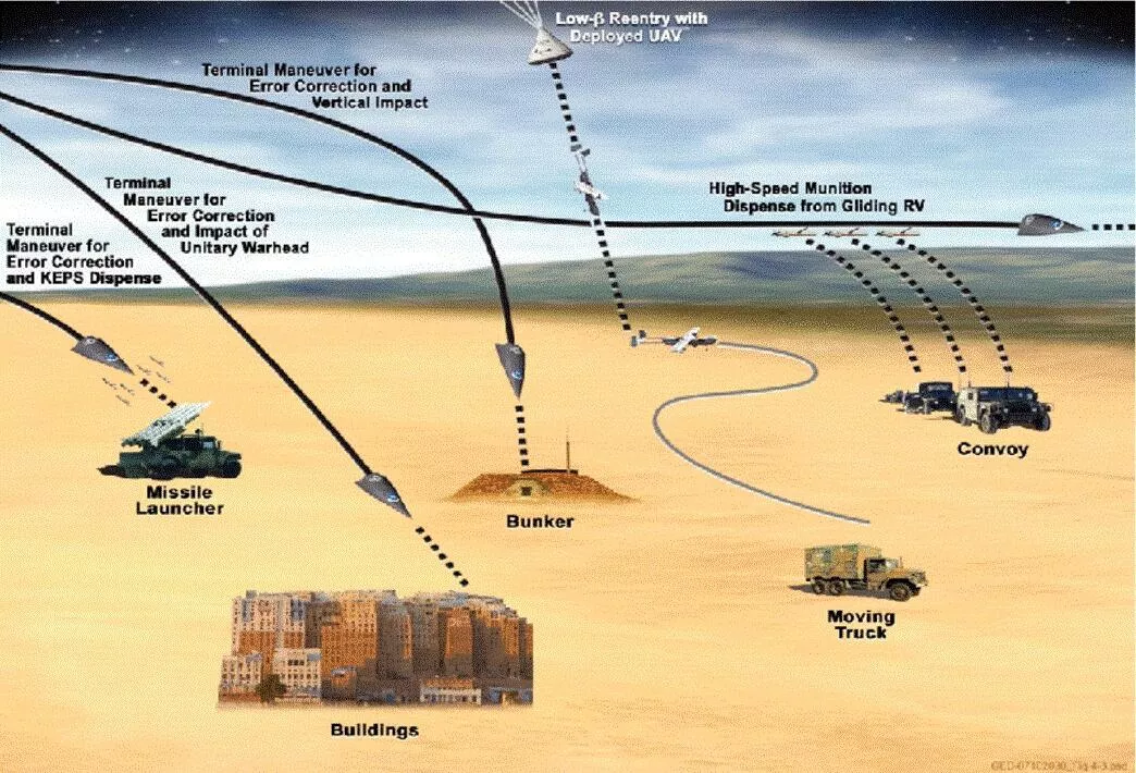 Иллюстрация из справочника Министерства обороны США «US Conventional Prompt Global Strike: Проблемы на 2008 год и последующие годы», демонстрирующая некоторые цели, против которых могут быть развернуты гиперзвуковые планирующие аппараты. Концепция «Быстрого конвенционального удара» предусматривает нанесение массированного ракетного удара по противнику США (в том числе стратегическому противнику, обладающему ядерным потенциалом) с использованием обычного оружия с целью обезглавить его руководство и вывести из строя как можно большую часть его стратегических возможностей. Photo : National Research Council et al.