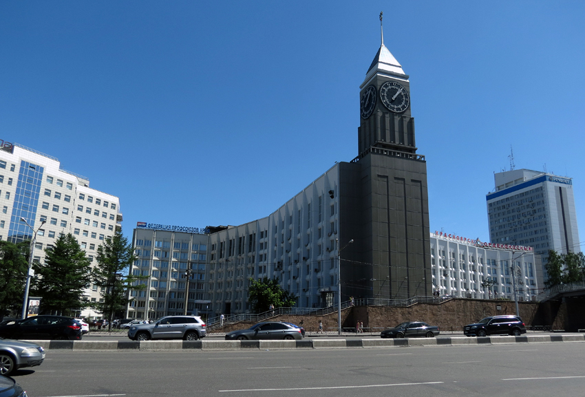 На панорамах и задних планах Красноярска часто видна эта серая башня, которую тут почти официально называют Красноярский биг-бен. Она пристроена в 2001 году к "трилистнику" здания городской администрации, а проектировалась, вроде бы, ещё в 1970-е годы: Театральная площадь в Красноярске появилась в 1961 году, с открытием Коммунального моста через Енисей, и замышлялась как единый с ним ансамбль (на другом же конце устроили Предмостную площадь), на мой взгляд далеко не худший для своей силикатно-коробочной эпохи. Справа налево Енисейское речное пароходство, администрация города, гостиница "Красноярск"... ...и давшей площади название Красноярский оперный театр (1966-78), зародившийся ещё в 1886 как оркестровая труппа при городском театре (его скромное здание я показывал в прошлой части). На переднем плане памятник Чехову (1995) - если Томск он в своих путевых заметках обругал и обозвал "свиньёй в ермолке", то Красноярск охарактеризовал как "...самый лучший и красивый из всех сибирских гор