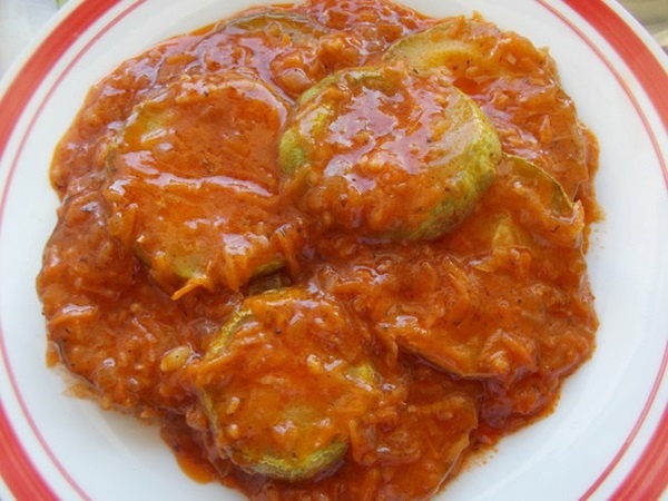 Кабачки в томатном соусе — французское блюдо. Меня с ним познакомили друзья из Прованса (юг Франции), с которыми я общаюсь на кулинарные темы. Мне понравилась идея, и я попробовала его приготовить, но с менее острым соусом. По моему мнению, острый соус с перцем чили больше сочетается с мясом, а не с овощами. Для этих кабачков я приготовила сладкий и слегка острый соус, такой, как я люблю, который очень хорошо сочетается с нежной и прохладной текстурой кабачков. Их можно украсить кружочками острого перца и подавать под сладким томатным соусом. Приготовление: Кабачки очень хорошо вымойте (потому что они будут готовиться с кожицей). Нарежьте их кружочками толщиной около 1 см, посолите. Обжарьте на среднем огне с обеих сторон в достаточном количестве масла, пока они не станут мягкими и слегка подрумянятся, после чего снимите лопаткой на тарелку, застеленную бумажными полотенцами (пусть впитается лишнее масло). Приготовьте соус: лук очистите, вымойте, нарежьте небольшими кубиками и осторожн