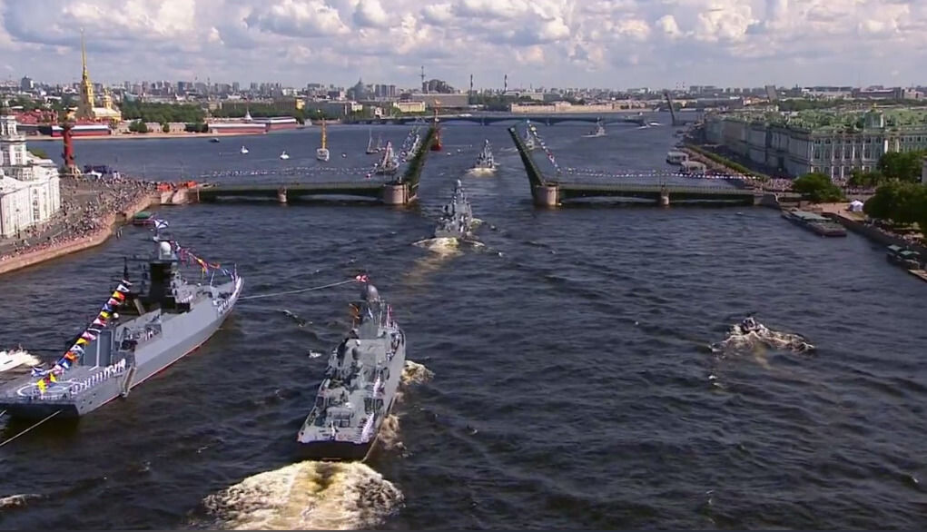 После приветственной речи президента начался проход военных кораблей, прибывших к участию в параде. Глава государства и другие высокие гости наблюдают за проходом с трибун на Адмиралтейской набережной. Среди участников смотра – линейный корабль «Полтава», малые ракетные корабли «Серпухов» и «Одинцово», корвет «Бойкий», патрульный корабль ледового класса «Иван Папанин», подводная лодка «Можайск», эскадренный миноносец «Цзяо Цзо» Военно-морских сил Китайской Народной Республики, учебный корабль «Ла Суммам» Военно-морских сил Алжирской Народной Демократической Республики, фрегат «Табар» Военно-морских сил Республики Индии. Всего к участию в параде в 2024 году привлечены 20 надводных кораблей и катеров, одна подводная лодка, четыре парусных судна, более 2,5 тысячи военнослужащих. Ранее сообщалось, что Владимир Путин выступил на главном военно-морском параде.