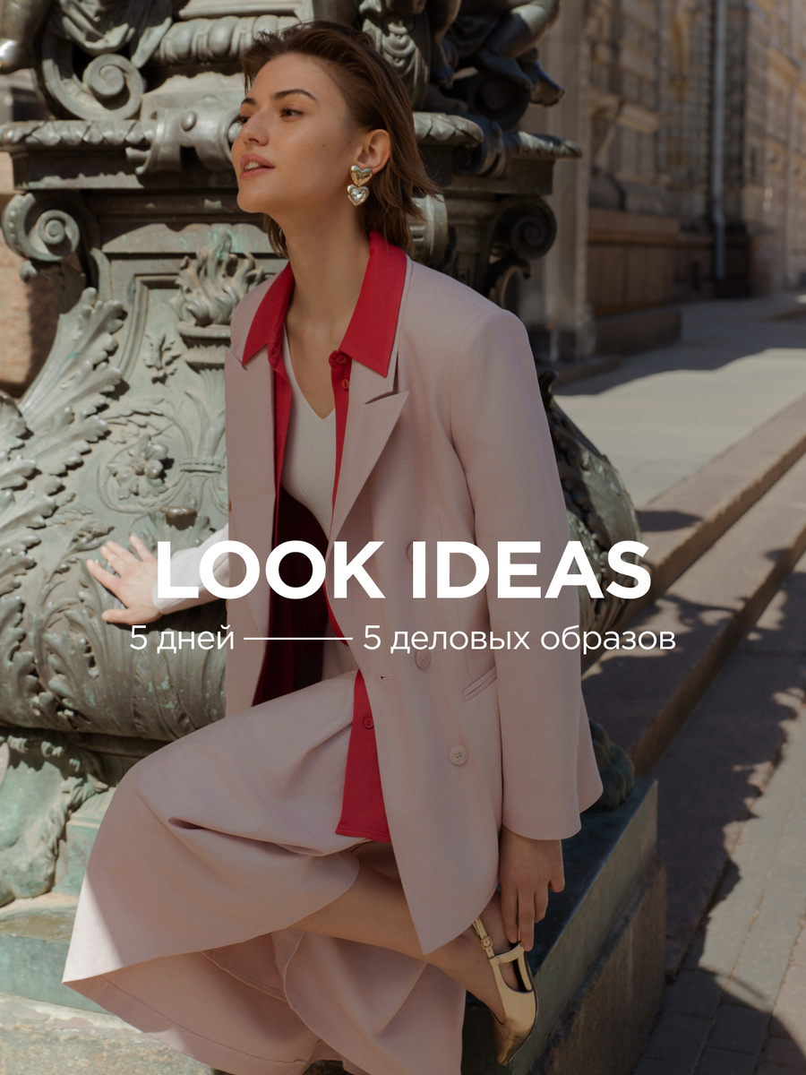 Начните неделю с уверенности в себе с жакетом и юбкой-миди из текстурной костюмной ткани в розовом оттенке "пыльной розы". Для многослойности выбирайте кроп-топ нейтрального цвета и контрастную рубашку. Вторник