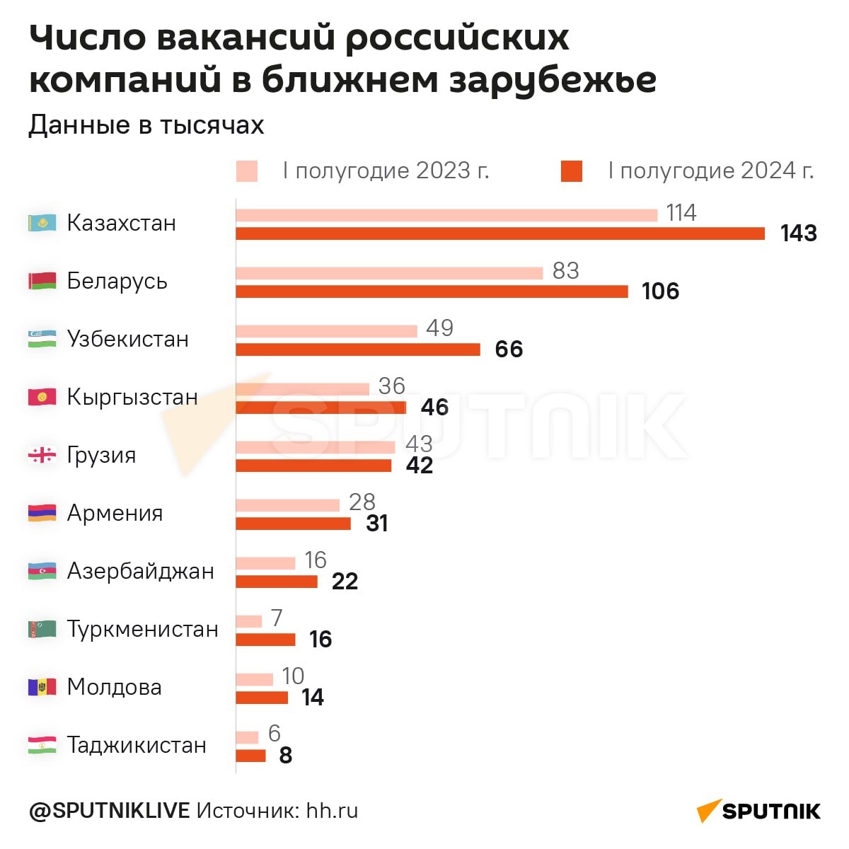 Специально для @sputnik_rus аналитики онлайн-платформы hh. ru раскрыли нюансы рекрутинга: В основном ищут разнорабочих и строителей, это те специалисты, которые сегодня находятся в дефиците. Чаще всего работодатели предлагают вахту, реже - полноценную релокацию в Россию. Причины кадрового голода в РФ: Сложная демографическая ситуация (последствия кризиса рождаемости 90-х) наложилась на всплеск бизнес-активности. Людей недостаточно, чтобы покрыть потребность компаний для роста и развития. На одну вакансию в среднем по стране приходится 3,1 резюме при норме не менее 4,0. Потребности рынка труда РФ: В июне этого года количество активных вакансий на 22% превысило показатели аналогичного периода прошлого года. Чаще всего компании находятся в поиске специалистов из профессиональных областей: ▪️Продажи, обслуживание клиентов - 22% вакансий июня ▪️Рабочий персонал - 22% ▪️Производство, сервисное обслуживание - 15% ▪️Строительство, недвижимость - 15%, ▪️Розничная торговля - 13%