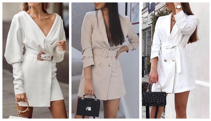 Уже не первый сезон в списке лидеров модной индустрии удерживает свои позиции стильное платье-пиджак. Сегодня представлены очаровательные и разнообразные комбинации образов с этим нарядом, от которых невозможно оторвать глаза. Полюбуйтесь на этот очаровательный комплект - мини платье-пиджак в двух цветах с контрастным поясом. Стилисты решили не перегружать этот яркий наряд дополнительными акцентами, идеально дополнит его остроносая обувь на высоком каблуке или босоножки с тонкими ремешками. Следующий вариант выразительного аутфита включат в себя колорблок платье-пиджак, выполненное из белой и бежевой тканей. Чтобы образ смотрелся интересней, гуру моды дополнили этот наряд леопардовым тонким ремнем, многослойной золотой цепью, а также массивными сережками. Строгий и минималистичный вариант эффектного образа в трендовом монохроме, получился благодаря мини черному платью-пиджаку и тонкому кожаному ремню. Этот сдержанный и лаконичный look лучше не перегружать яркими деталями. Достаточно бу