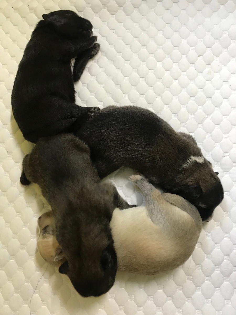 Вчера олегонятам осполнилось 7 дней. В принципе, ничего не изменилось, за исключением того, что вес они удвоили с приличным запасом. Вес при рождении 325, 345, 310 и 310г. На 7е сутки соответственно - 710, 715, 660 и 665г. Обычно, считается нормальным рост щенков, когда вес при рождении удваивается к 10-му дню. У них получилось к неделе. То есть, недостатка в питании они не испытывают явно. И коготочки я обычно подстригаю в 10 дней. Этим уже после фоточек сразу и отстригла, чтоб мамку не расцарапали. Так как коготочки уже ого-го! Глазки еще не открылись, но реснички уже хорошо просматриваются и щель для глазок стала заметной и глубокой. И уже видно, как под веками они двигают глазюками и даже жмурятся. То есть, вот-вот-вот. Мордочки стали заострятся к самому носу. Долго колебалась с именем кобелю. Очень понравилась кличка Ошкуй. Но когда напомнили про остров Ольхон, то имя определилось сразу. Был бы он светлым, может быть, Ошкуй и победил. Очень красивое имя. Но он все-таки рыжий, пот