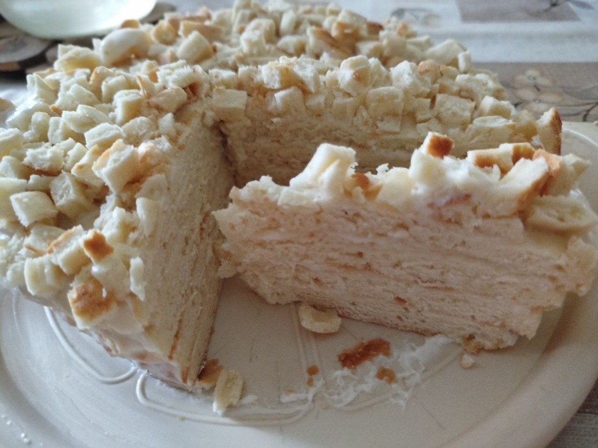 7. Охлаждение и подача: Как только коржи остынут первый корж смазать обильно сметаной с сахаром и сверху положить второй корж и тоже смазать кремом, затем уложить так 3 и 4 коржи. Сверху посыпать крошкой (крошку можно сделать из 4 коржа или обрезать края с каждого выпеченного коржа). Дать пропитаться в прохладном месте 5-6 часов