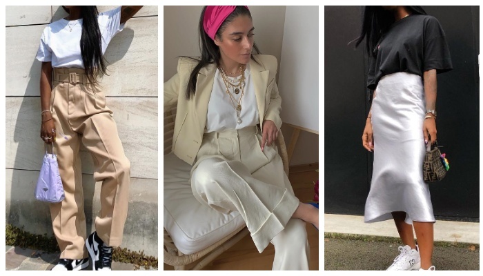 Как создавать стильные образы с футболками? Оставайтесь с нами, советы стилистов помогут вам научиться сочетать базовые футболки с другими предметами одежды. Давайте начнем с образа, на который многим трудно решиться. Не стоит бояться выделиться из толпы, мир моды богат и разнообразен — экспериментируйте. Вот какой замечательный наряд получился благодаря базовой оверсайз футболке, шелковой миди юбке с высокой талией, а также белым кроссовкам, которые можно заменить высокими кедами. Чтобы фигура выглядела пропорциональной, футболку лучше носить в заправленном виде. Для гармоничного завершения к данному набору вещей можно добавить высокие носки, интересную контрастного цвета сумку, а также акцентную бижутерию или же солнцезащитные очки. Продолжаем рушить стереотипы: яркая футболка + миди юбка плиссе + цветные кроссовки + сумка в минималистичном исполнении. Следующий вариант аутфита также включает в себя однотонную базовую футболку, которая идеально перекликается с голубой юбкой прямого ф