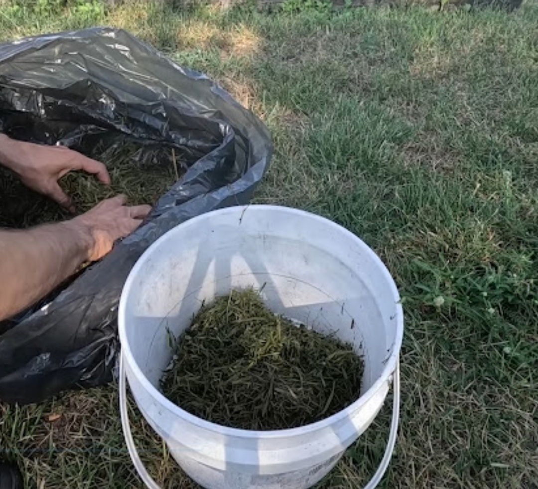 Так как я люблю натуральные удобрения, то использую различные виды растительного навоза. Первый материал для навоза, который приходит на ум, – крапива. Но кроме нее есть и другие растения, которые заполоняют участок и из которых можно легко и быстро сделать жидкое удобрение. И эти растения — обычная трава. Траву (это могут быть любые сорняки, не важно) предварительно нужно скосить. Дальше ее измельчить, ссыпать в черный полиэтиленовый пакет (я имею ввиду плотный для строительного мусора). Скошенная трава должна быть влажной. Если скосить траву утром, то она как раз будет от росы сырая. Если косите траву днем и она сухая, нужно будет ее немного полить водой в мешке. Завяжите мешок и поставьте его на солнце. Трава в мешке будет нагреваться и в тот же день начнется процесс брожения. Такое брожение в мешке под воздействием высокой температуры превращает полезные нерастворимые вещества, содержащиеся в растительных клетках, в растворимые, которые лучше усваиваются растениями. В летнюю погоду