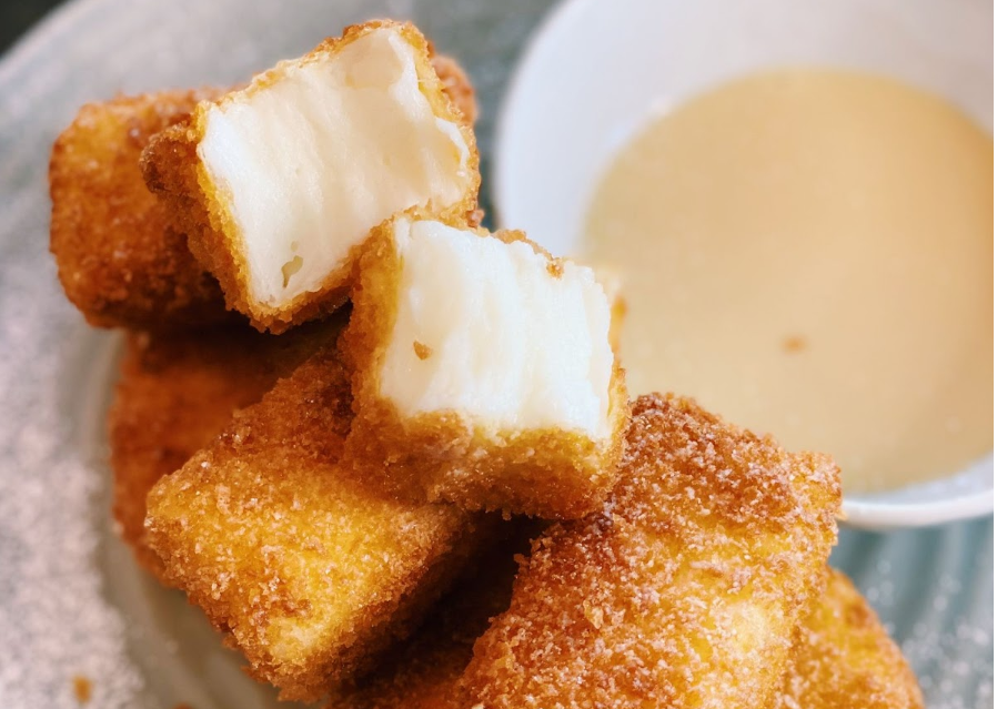 Популярный десерт из Поднебесной, для приготовления которого молоко варится с сахаром и кукурузным крахмалом. Полученная затвердевшая масса панируется и обжаривается во фритюре. Блюдо на удивление простое, а про состав даже говорить не приходится. Правда, понадобится время. Накормишка советует использовать молоко с повышенным содержанием жиров, от 3,5 %. Панировка: 1. Перелейте молоко в кастрюлю. Добавьте крахмал и сахар. Готовьте, помешивая, на средне-медленном огне в течение 25 минут, пока масса не загустеет. По консистенции она должна быть похожей на сгущенку. На густую сгущенку. Когда вы набирает ложку этого месива и переворачиваете, оно не должно быстро соскальзывать. 2. Остудите молочную смесь, переложите ее в контейнер. Уберите в холодильник на 2 часа. Обязательно разровняйте ее, чтобы потом можно было сделать ровные срезы.
