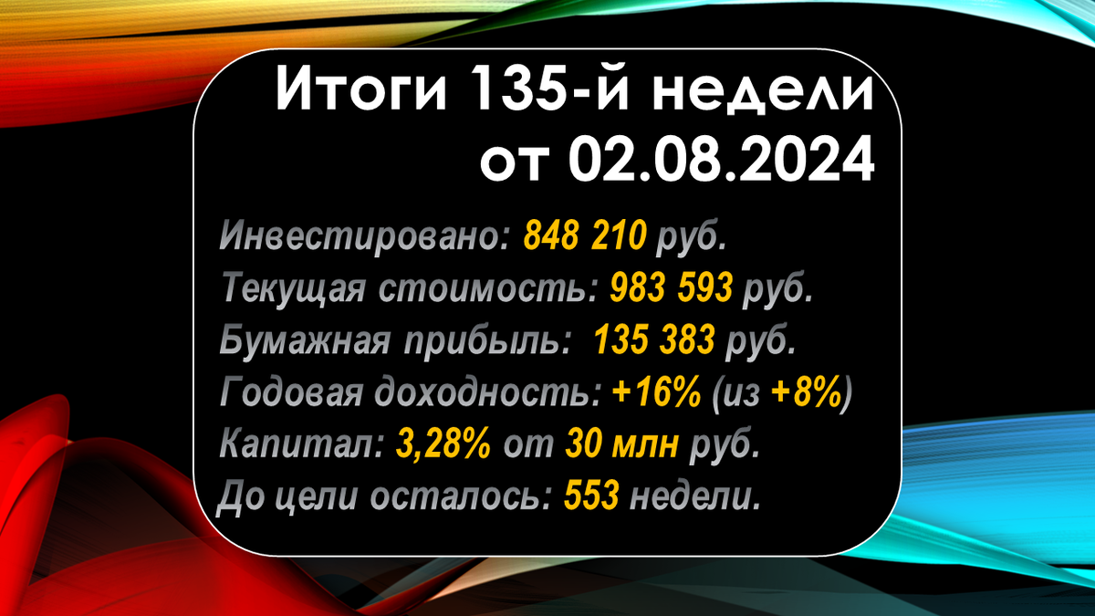 Меня зовут Артем, мне 34 года и мы с семьей живем в Москве. Публичные инвестиции на этом канале осуществляю уже 3-й год на еженедельной основе. Их целью является создание капитала в 30 млн рублей к 2035 году (в ценах 2022 года) и дальнейшая жизнь на пассивный доход. На этом канале я постараюсь раскрыть основные принципы грамотного инвестирования, которыми пользуюсь сам для достижения своей цели (здесь моя инвест стратегия, а здесь инвест цели на 2024 год). Мои покупки активов на 135-й неделе можно посмотреть в этом видеоролике. 📈Индекс Мосбиржи снизился на: -2,7% 📈Портфель снизился на: -0,8% По результатам 31-й недели в 2024 году портфель в очередной раз опережает Индекс Мосбиржи на +1,9%. Это уже 21-я победа портфеля... Индекс Мосбиржи был впереди только 10 раз в этом году. 📈Индекс Мосбиржи снизился на: -9,9% 📈Портфель снизился на: -5,1% 🥇 Россети МР (+3%) 🥈 Фонд золота GOLD (+1,3%) 🥉 Россети ЦиП (+0,7%) 🔻Татнефть (ап) (-4,7%) 🔻Сегежа (-4,3%) 🔻Татнефть (ао) (-3,9%) Все показ