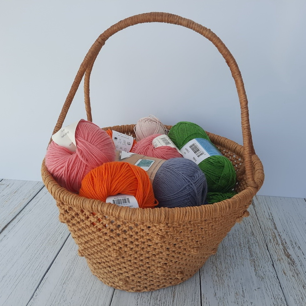 Корзину подарил мне супруг. Он сам сплел ее в технике макраме. В ней я храню мотки пряжи, которые использую в очередном проекте. Туда же складываю еще незаконченный проект, над которым работаю.