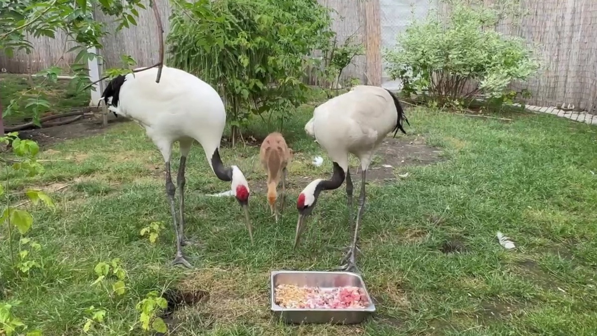 Его родители — возрастная пара, птицам 20 и 30 лет. Появление потомства в таком возрасте бывает нечасто. Птенец одного из самых крупных и эффектных видов журавлей появился на свет 24 июня! Детеныш вылупляется из яйца, покрытый пухом ярко-рыжего цвета, а позднее становится серенький. Первые 10 дней жизни птенца кормят его родители. Они приносят ему Зоопарковские корма: мелкие кусочки мяса, рыбы, яйца, творог, кормовых насекомых и грызунов. Сейчас журавленок повсюду следует за своими родителями! «У журавлей нельзя определить пол по внешним признакам. Это делается только по анализу крови. Конечно, зоологи не хотят подвергать малыша стрессу и не берут журавленка на руки. К тому же самец рьяно охраняет свое семейство и при приближении к ним сотрудников начинает рычать и бросается в драку» — рассказала Светлана Акулова, генеральный директор Московского зоопарка. Для японских журавлей там созданы все условия. Эти птицы моногамны и образуют постоянные пары. Обычно самка откладывает два яйц