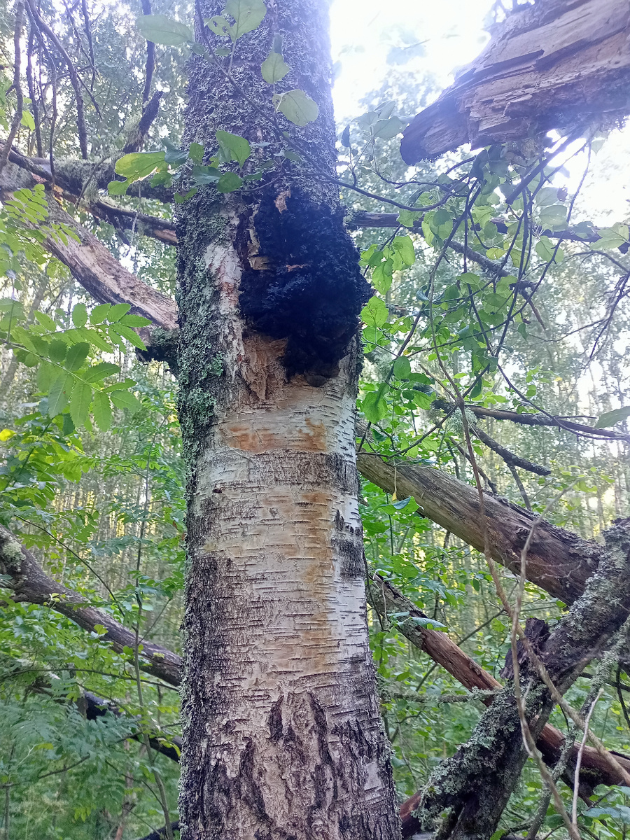 То, что называют обычно чагой, фактически, является стерильным наростом трутовика скошенного (Inonotus obliquus). И выглядит вот так: Сам гриб не особо виден. Он внутри дерева паразитирует и проявляется в виде поддтеков бурой жидкости сочащейся из трещины в березе. Примерно так: Этот гриб входит в Государственную Фармакопею РФ. И вот лет десять назад решил провести эксперимент: вырастить чагу у себя на огороде. Точнее, на том месте, где по кадастровому плану должен быть огород, а по факту участок взятый мной в аренду зарос молодым березняком. И вот над этим березняком и был проведен ряд экспериментов. Один из них по выращиванию чаги. Честно говоря, я уже решил, что эксперисент провалился. Все-таки слишком молодой подрост березы использовался. Однако пару лет назад начали появляться наросты чаги почти на всех зараженных деревьях. Итак. Что было сделано. В 2013 году в ближайшем лесу собрал образец дикой чаги. Причем срубил не только верхнюю часть с максимальным количеством меланина. (Д