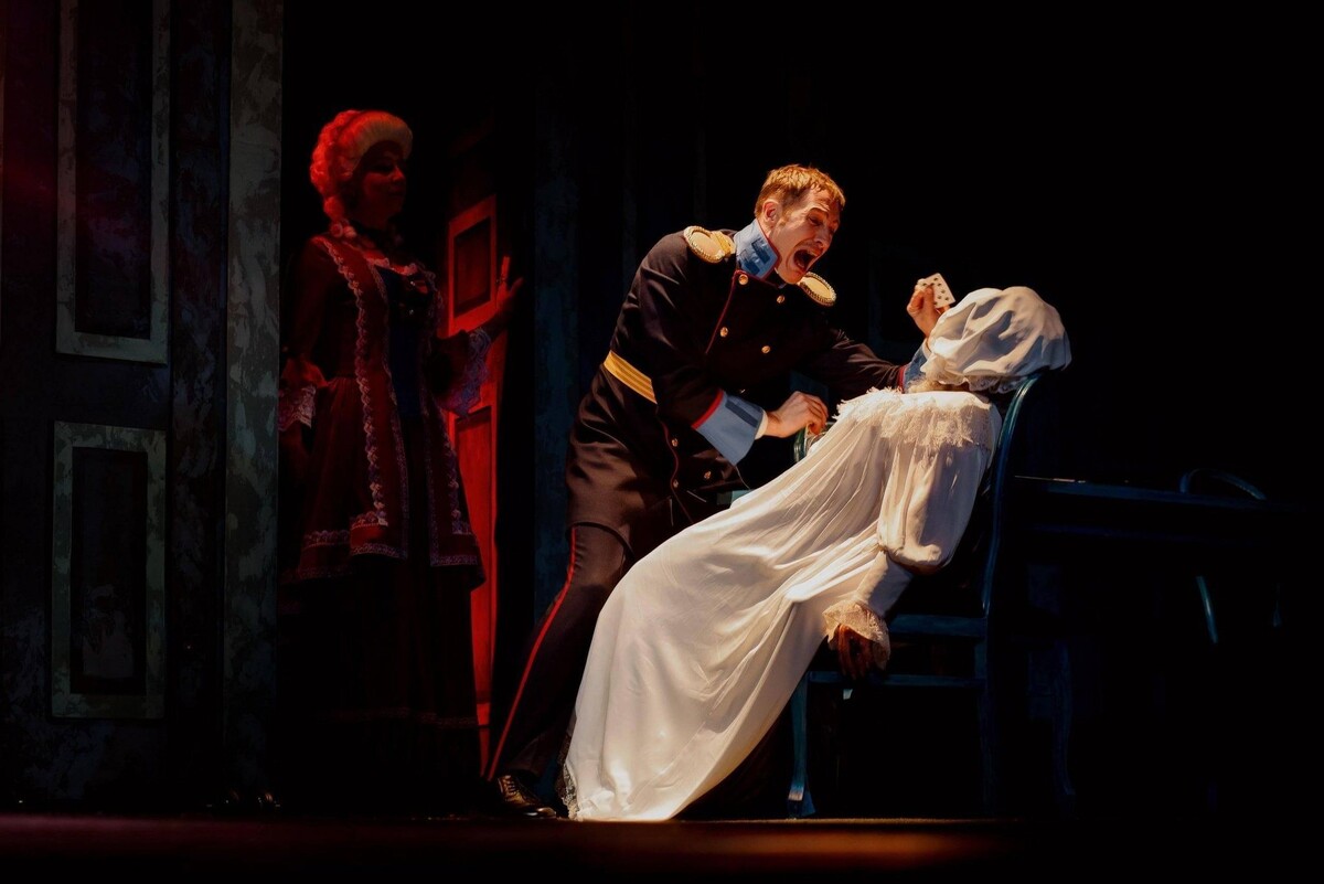 Но обо всем это было забыто, когда на знакомой мне сцене стартовало преставление «мистической драмы». Именно так режиссер спектакля Алексей Доронин обозначил жанр постановки. Добавим, что он же и автор инсценировки и в соавторстве с супругой изобрел оригинальную сценографию, позволяющую разыгрывать ключевые эпизоды прямо на авансцене. При этом распахивая декорацию вглубь сцены, напоминая зрителям, что «Пиковая дама» - одно из самых петербургских сочинений А.С. Пушкина. И в то же время – инфернальность его текста тоже никуда не исчезла, и потому сбивает с толку многих из тех, кто берется его интерпретировать.