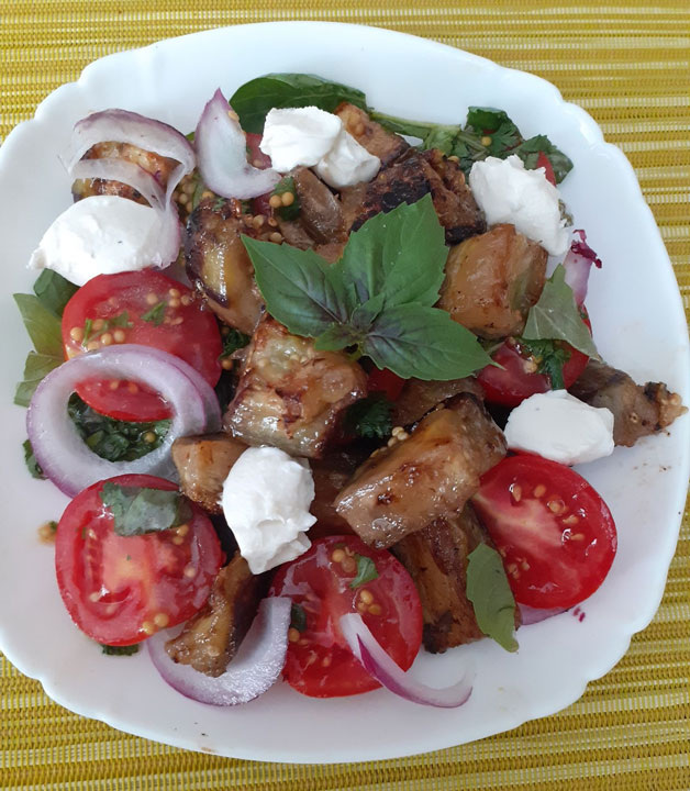 На обед - салат из помидоров с базиликовым соусом, обжаренные баклажаны и творожный сыр. Вкусно, сытно и полезно. Особого рецепта-то и нет. К помидорам сделала базиликовый соус: ✔ Хорошее ароматное подсолнечное масло (можно оливковое, но я люблю именно ароматное); ✔ Соль; ✔ Сок лимона; ✔ Зернистая горчица; ✔ Чеснок; ✔ Базилик. Чеснок и базилик мелко порубить, смешать с остальными ингредиентами, дать настояться некоторое время. Соусом полить помидоры. Ну а к салату – баклажаны, обжаренные до румяности на почти сухой сковороде, и ещё - творожный сыр с солеными огурцами и немного зелени (у мен я- кинза). Рецепт на странице Автор рецепта – Tatiana Azovochka