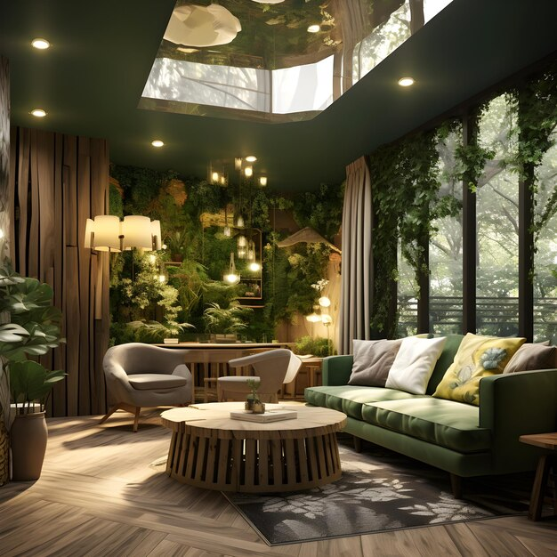 Хотите создать уютное пространство, где смешиваются экологичность и функциональность? Тогда вам просто необходимо ознакомиться с пошаговой реализацией гостиной в лесном или же эко стиле! Здесь вы найдете гармонию с природой, уникальные растительные акценты и натуральные материалы, которые придадут интерьеру уединенности. Невероятно красивый интерьер на фотографии мы и будем с вами реализовывать! Давайте узнаем, что для этого необходимо. На входе мы видим небольшую, но очень уютную комнату. Центром комнаты служит круглый деревянный журнальный столик. Можно представить, что это лесной пенек, который стоит в самой середине поляны в глубине леса. Варианты деревянного журнального столика: Около окна расположился диван светло-зеленого цвета с мягкими подушками цветочных оттенков. Представьте, что вы устали и идете где-то глубоко в лесу, но перед вами появляется небольшой островок свежей травы. Вовсе не обязательно садиться, невероятное расслабление чувствуется от одного вида. Такие же ощуще
