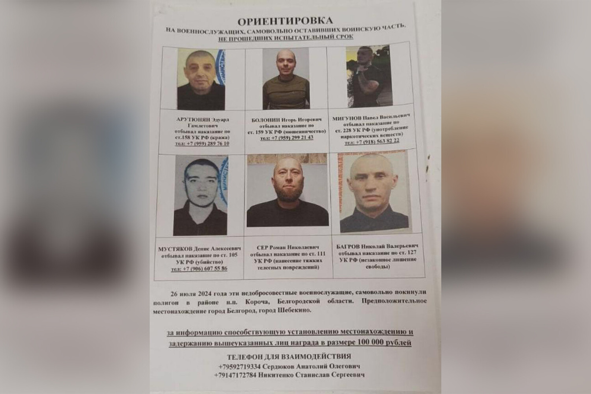 Двое были осуждены за убийство, трое за нанесение тяжких телесных повреждений, один за незаконное лишение свободы. Сейчас ведутся их поиски. В Белгородской области девять заключенных, подписавших контракты с Министерством обороны России, сбежали с полигона. Об этом сообщил Telegram-канал «Пепел». По данным канала, побег произошел на полигоне в Корочанском районе. Ориентировка на беглецов поступила в шебекинские отделения полиции. Известно, что среди сбежавших двое были осуждены за убийство, трое — за нанесение тяжких телесных повреждений, а еще один контрактник получил срок за незаконное лишение свободы. Остальные осужденные были судимы по менее серьезным статьям. Стоит отметить, что побег совершили заключенные, которые уже были мобилизованы и заключили контракт с Министерством обороны. По данным Telegram-канала, побег произошел 26 и 27 июля. В настоящее время местонахождение беглецов неизвестно, однако есть предположения, что они могут находиться в Белгороде или Шебекино. В настоящее
