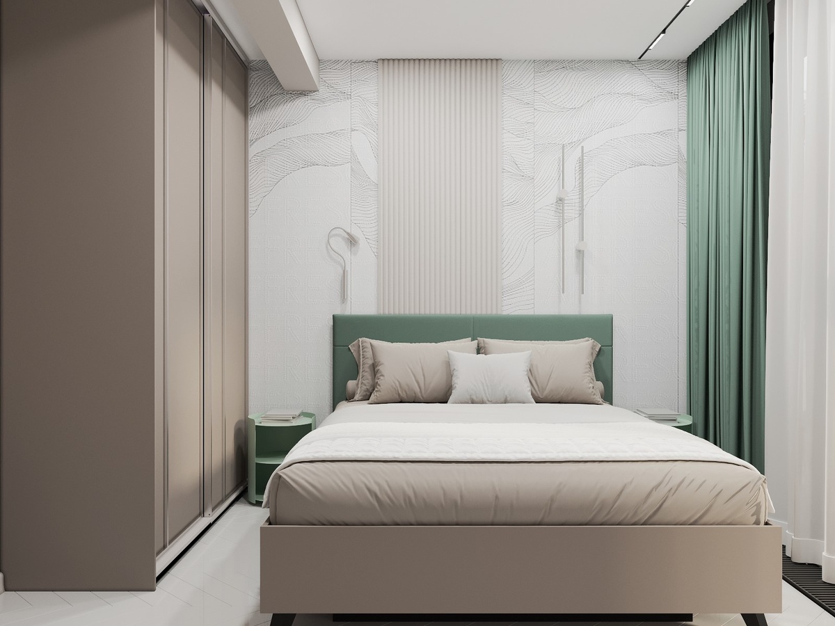 Как и обещала, выкладываю следующую часть по проекту, и это спальни. Начнем с мастер спальни. За изголовьем кровати используются 3д панели , высотой 280см и фреска. Эскиз фрески изготавливался на заказ, меняли цвет и добавляли серебряные узоры, так как стандартные оттенки нам не подходили. В светильниках сделали ассиметрию, один из бра с гибким проводом , чтобы удобно было направлять поток света для чтения книги. Прикроватные тумбы на колесиках и круглые по форме, шкаф сделали с дверьми купе, так как пространства не много, и нужно было продумать удобное открывание шкафа. Напротив кровати подвесная тумба и тв. Фасады тумбы сделаны с рельефом, в поддержку двери в комнату. Цвет штор решили подобрать в тон к изголовью кровати. Шторы предполагается сделать на электро карнизах, что облегчает их эксплуатацию.В качестве напольного покрытия, используется инженерная доска с рисунком "французкая" елка. Теперь переходим к гостевой спальне. В гостевой спальне на полу так же используется инжене