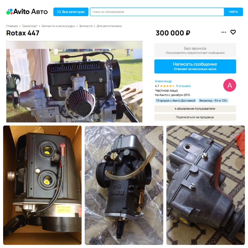 Андрей из Санкт-Петербурга долго искал возможность приобрести двигатель Rotax 447 для легкомоторных самолетов. Поиски осложнялись тем, что данный двигатель уже снят с производства. Нужный товар был найден на Авито. Цена не маленькая — 300 000 рублей.