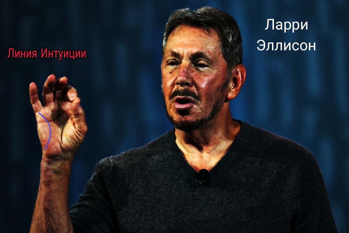 Линия Интуиции выглядит как линия в виде полумесяца, расположенная на холме Луны, выгибаясь к центру ладони и проходящая от холма Плутона до Меркурия. Линия Интуиции наделяет обладателя повышенной чувствительностью к изменениям в окружающем пространстве, способностью предчувствовать события, сканировать мысли, обладать экстрасенсорными способностями, видеть вещие сны и погружаться в них глубже, развивая, различные техники. Проявляется интуиция у каждого по разному, в зависимости от того в какой сфере человек находится, развивает он свои способности или нет. Я думаю, что в судьбе Ларри Эллисона, крупнейшего предпринимателя, основателя компании Oracle и инвестора, интуиция сыграла далеко не последнюю роль, а скорее всего одну из ключевых. А он обладатель потрясающей линии Интуиции - чёткой и глубокой. Связывает она у него два холма Плутона и Меркурия и безусловно помогает заработать Ларри огромное финансовое состояние на IT - технологиях. Связь Плутона с энергиями власти, м