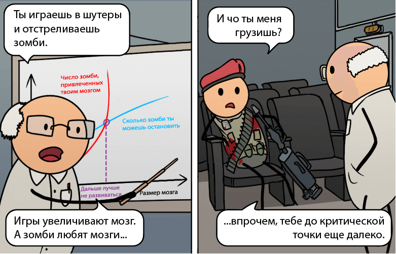В своём исследовании Бавельер говорит именно об экшен-играх, шутерах и стратегиях в реальном времени. После них учёные фиксировали позитивный эффект, который сохранялся в течение двух лет! Никакие якобы развивающие мозг игры, рекламируемые по телевизору или в интернете, не смогли даже приблизиться к такому результату.