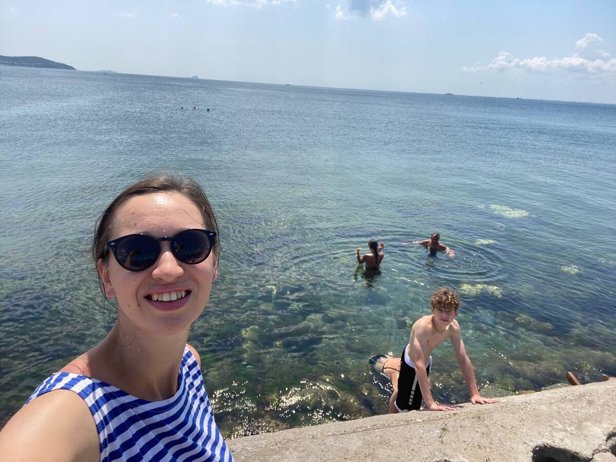 Рядом нашли местечко, где купались и загорали люди из разных стран. Я это место видела на фото в одной ныне запрещённой социальной сети. Там было здорово: море чистое, открытое, людей мало. Кто-то сделал спуск - привязал канатик к волнорезу.