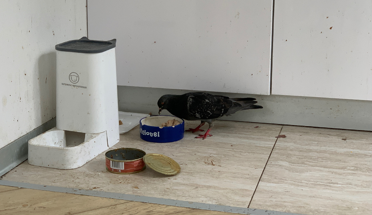 Каждый раз ко мне в квартиру заходят голуби. Прямо сейчас один из них сел на балкон и пешком зашел в открытую дверь квартиры. Шаги его слышны по всей квартире: : шлеп-шлеп, шлеп-топ, шлеп-топ. Куда он идет? Конечно, к чашке кота. Сейчас там лежит печеночная колбаса. Кот только мирно посматривает на птичку, как она аппетитно съедает его еду. Я, конечно, рад миролюбию кота. Только бы ему научиться так относиться и к людям. Особенно к незнакомым. Он может и лапой ударить, и даже укусить. Пора бы ему понять, что человек важнее птицы. Моего кота зовут Мурласик. Ему скоро исполнится 14 лет. Он ровесник киностудии «Юниор» им. Андрея Тарковского. Пока писал эти строчки, кот пошел доедать колбасу после птицы. Приятного ему аппетита.