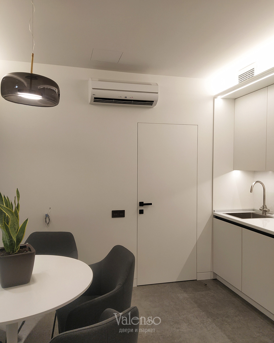 В интерьере этого офиса, разработанного в Архитектурной мастерской Д12, мы установили скрытые межкомнатные двери. На этапе возведения перегородок нами были установлены скрытые коробки, которые позже во время отделочных работ скрыли за штукатуркой, сделав абсолютно незаметными. В них мы установили полотна дверей - крашенные в цвет стен. И в результате получилось элегантное решение отлично подходящее в лаконичный дизайн офиса. При этом дверь в санузел покрашена в разный цвет с двух сторон. Двери мы дополнили ручками и фурнитурой в подходящем дизайне и чёрной отделке. Если вы хотите установить такие двери в свой интерьер, или интерьер ваших заказчиков - позвоните нам и мы предложим решение. Мы работаем на рынке больше 10 лет и не боимся сложных и ответственных задач.