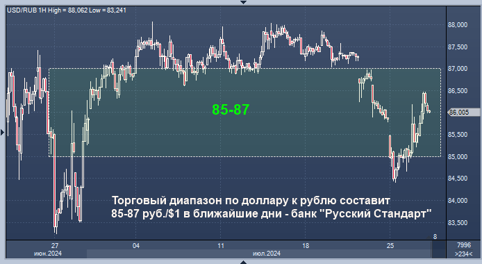 Торговый диапазон по доллару к рублю составит 85-87 руб./$1 в ближайшие дни - банк "Русский Стандарт" Курс доллара к рублю расчётный, фьючерс, вечный фьючерс и межбанк. Курс евро к рублю расчётный, фьючерс, вечный фьючерс и межбанк. Курс юаня к рублю биржевой, фьючерс, вечный фьючерс и межбанк. Торговый диапазон по паре рубль/доллар, скорее всего, составит в ближайшие дни 85-87 руб./$1, по паре рубль/евро - 94-96 руб./EUR1, полагает директор департамента операций на финансовых рынках банка "Русский Стандарт" Максим Тимошенко. "Пятничное решение ЦБ повысить ключевую ставку ожидалось рынком и вряд ли окажет существенное влияние на рубль, хотя и станет фактором его поддержки, - отмечает эксперт. - Тем временем доллару добавить оптимизма способны свежие данные министерства торговли США, свидетельствующие об увеличении ВВП США во втором квартале 2024 года на 2,8% в пересчете на годовые темпы. Повысились и темпы роста экспорта, а также импорта. Благоприятная для энергетического рынка новость