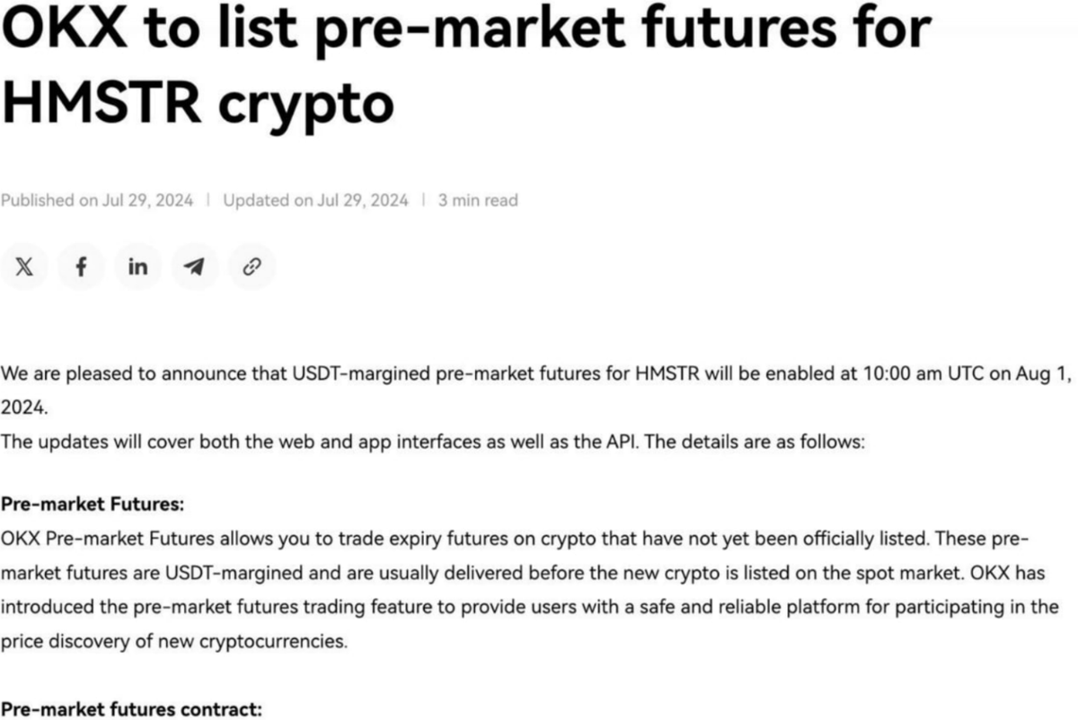 Сегодня биржа ОКХ объявила о предстоящем листинге токена хомяка HMSTR на премаркет торговле фьючерсами 1 августа 2024 года. Это еще не полноценный листинг, которого ожидают миллионы игроков телеграмм игры Хомяк (Hamster Kombat) по всему миру.