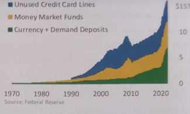 Зеленая область - валюта плюс депозиты до востребования (текущие счета), желтая область - средства денежного рынка, синяя область - неиспользованный кредит по кредитной карте.