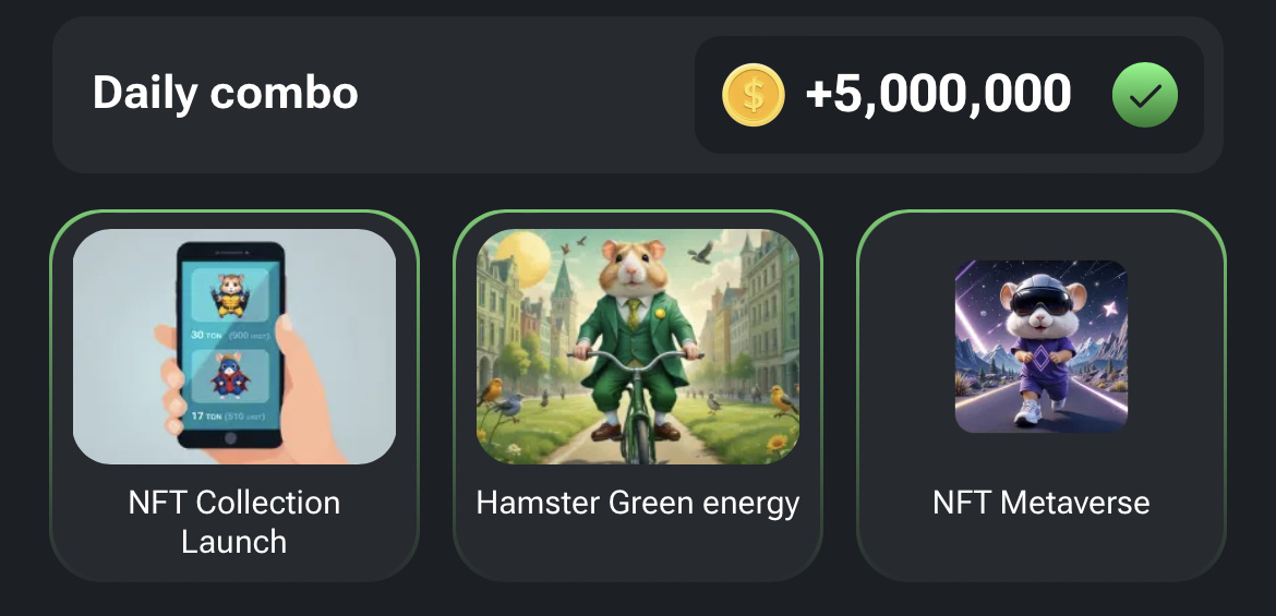 ✅Комбо карты на 29.07 ❗️Бонус за выполнение задания +5 млн. ❓Где найти комбо карты : • Hamster Green energy - Specials • NFT Collection Launch - Specials • NFT Metaverse - Web3 ПОДПИСЫВАЙСЯ НА МОЙ КАНАЛ , ЧТОБЫ НЕ ПРОПУСТИТЬ ОБНОВЛЕНИЯ HAMSTER COMBAT 🐹