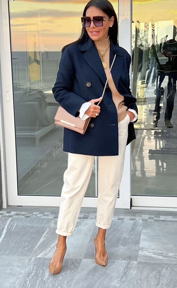 - Современная офисная классика – это прямые, чуть зауженные к щиколоткам и подвернутые брюки оттенка слоновой кости в сочетании со свободным прямым пиджаком угольно-черного цвета. Брюки дополнены белой рубашкой и светло-бежевым жилетом с высоким горлом. Комплект эффектно подчеркивается бежевой сумочкой и нюдовыми туфлями-лодочками. Образ выглядит стильно и элегантно, он в меру сдержанный и в то же время привлекательный.