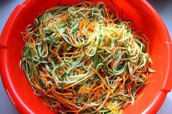 - Огурцы натереть соломкой до сердцевины с семенами (я бы сказала просто "обтесать" огурчик). Морковь так же натереть длинной тонкой соломкой, чеснок натереть на мелкой терке.